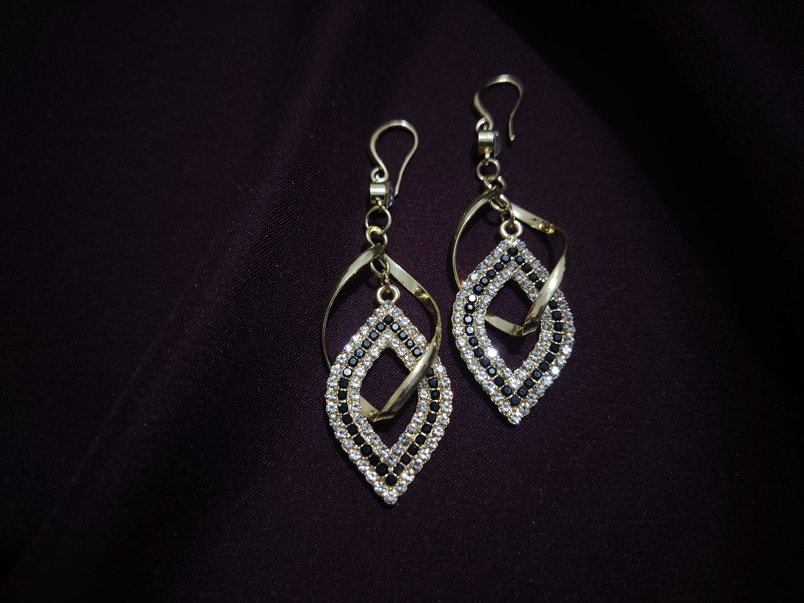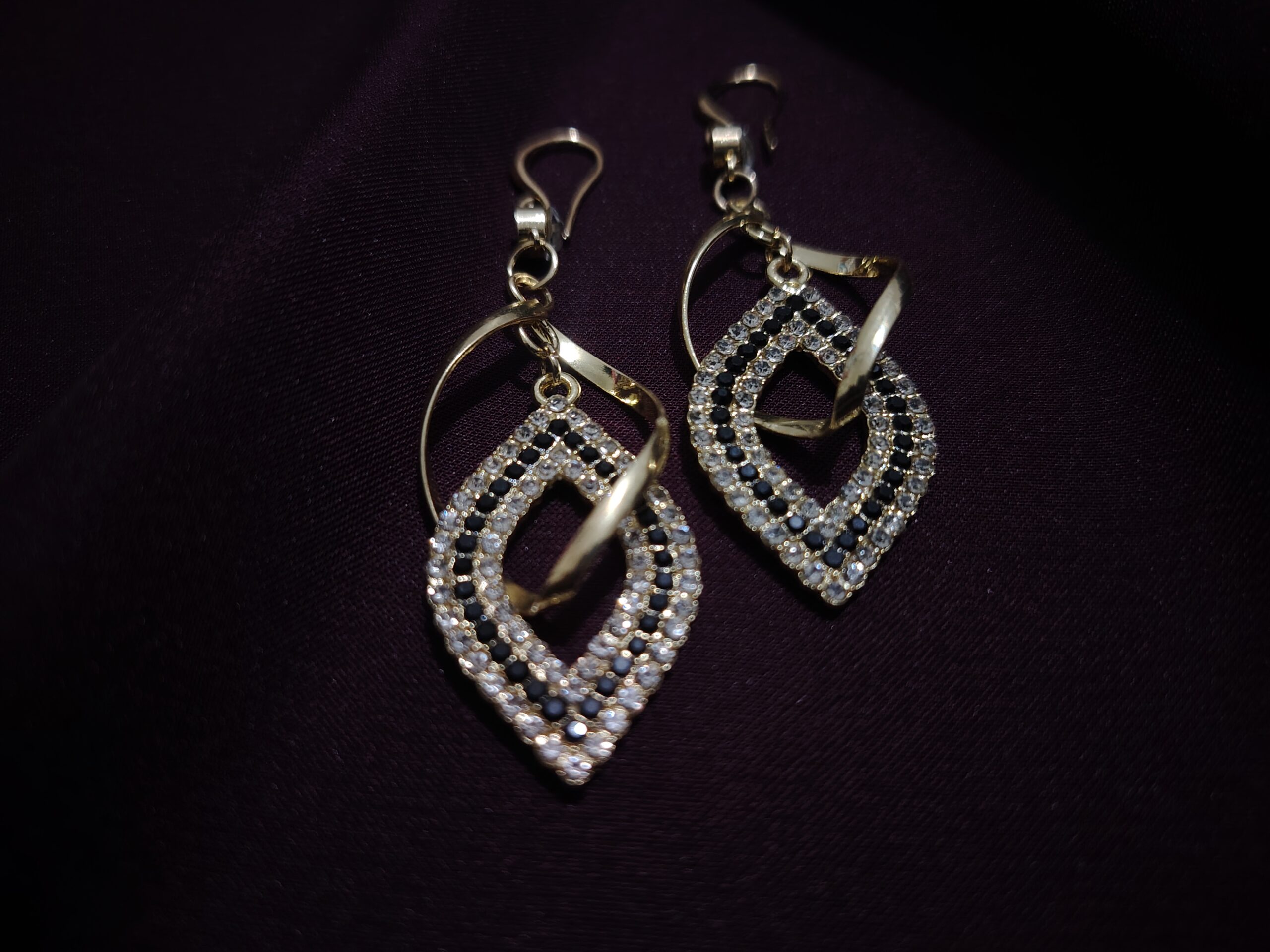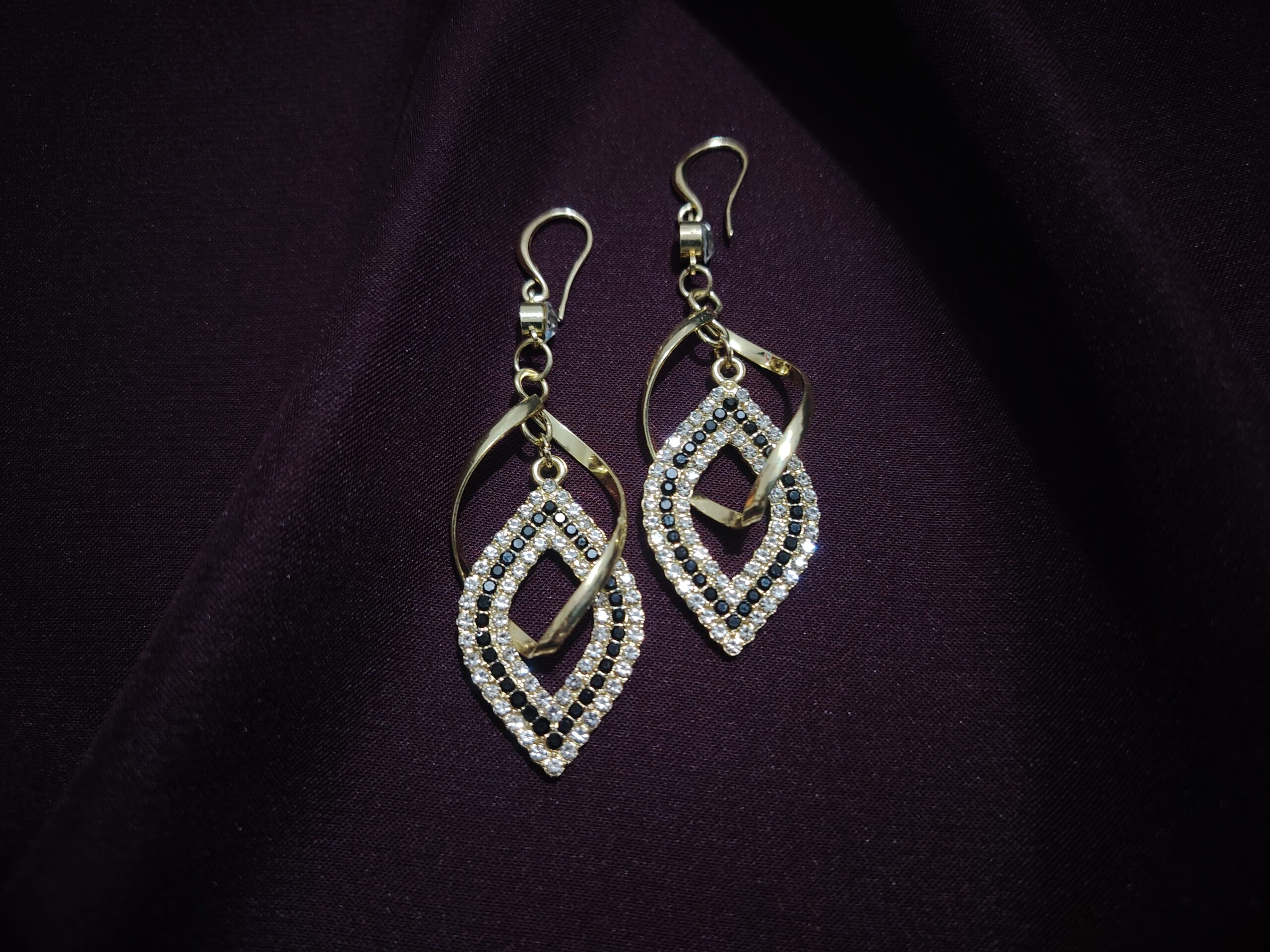 A striking blend of shimmer and sophistication, these marquise-shaped drops feature double rows of sparkling stones intertwined with a sleek gold twist. Perfect for adding bold elegance to any evening look.