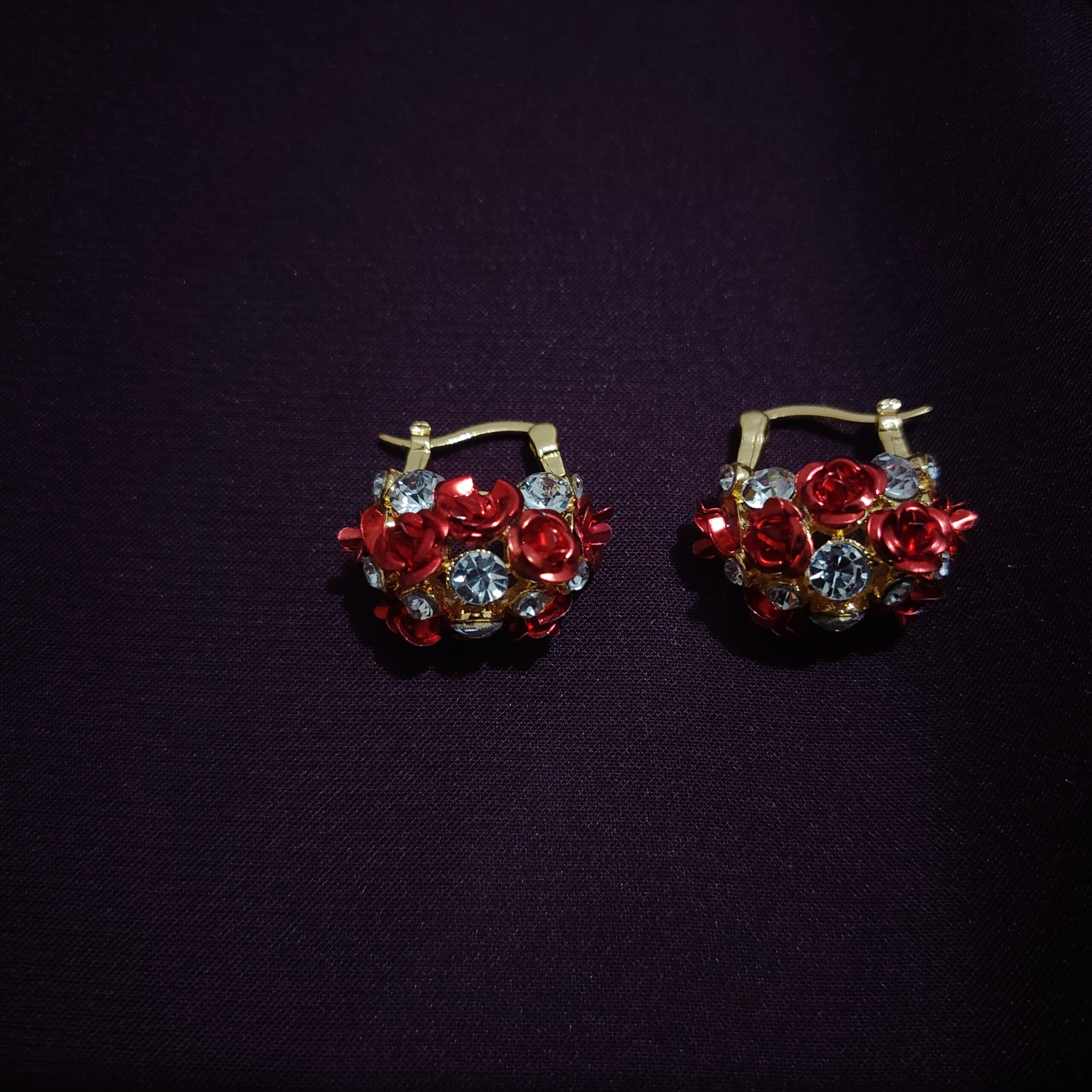 Bold and romantic, these gold-tone hoops bloom with rich ruby-red flowers and sparkling crystal accents. Their vibrant, clustered design adds a luxurious touch, perfect for elevating festive or evening looks with standout charm.